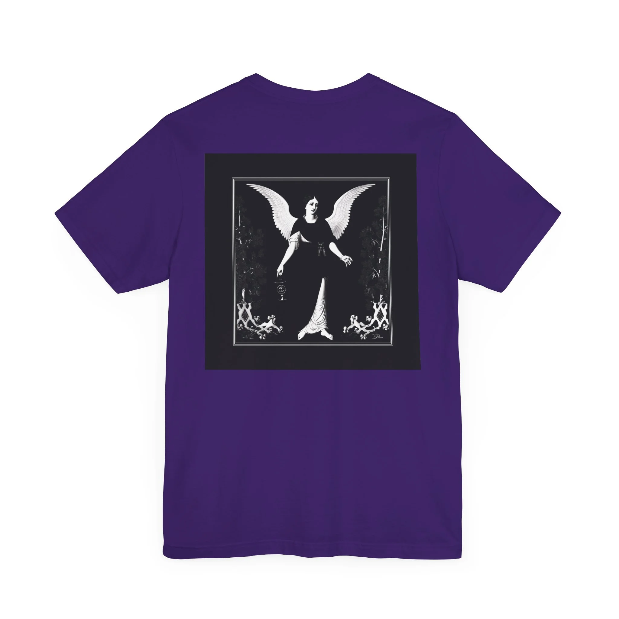 A vision from a forgotten cathedral Angel features a solemn, winged angel rendered in stark black and white, as if carved from stained glass or summoned from a gothic altar. Holding the scales of judgment and framed by withered trees, this divine figure walks the line between salvation and shadow.