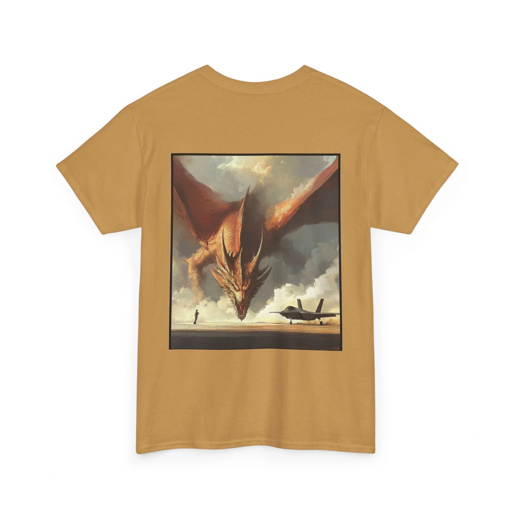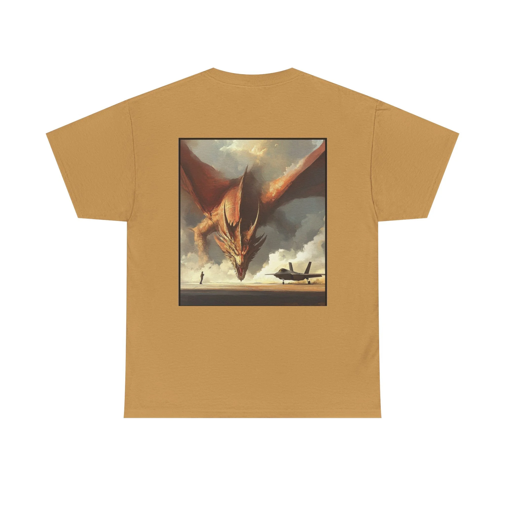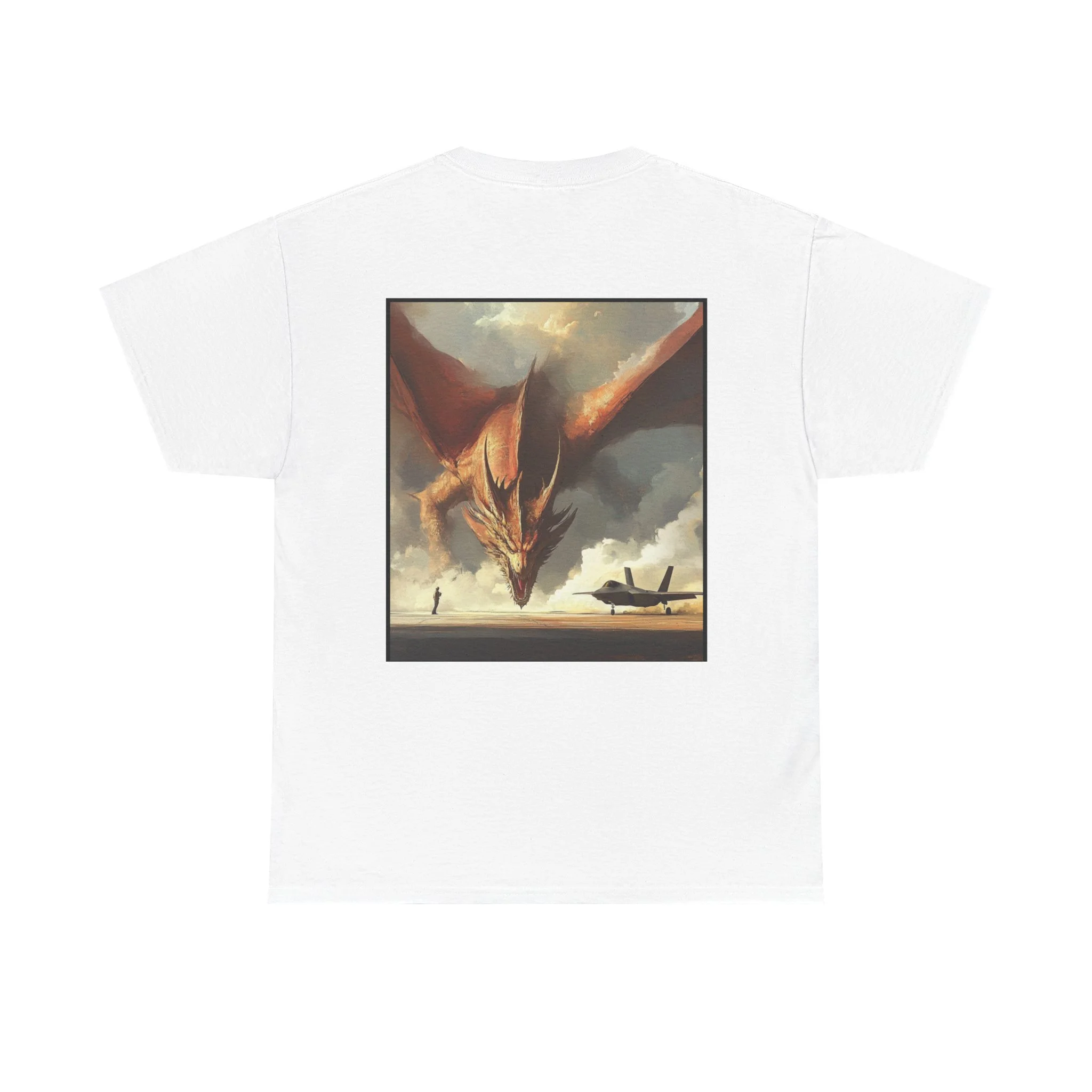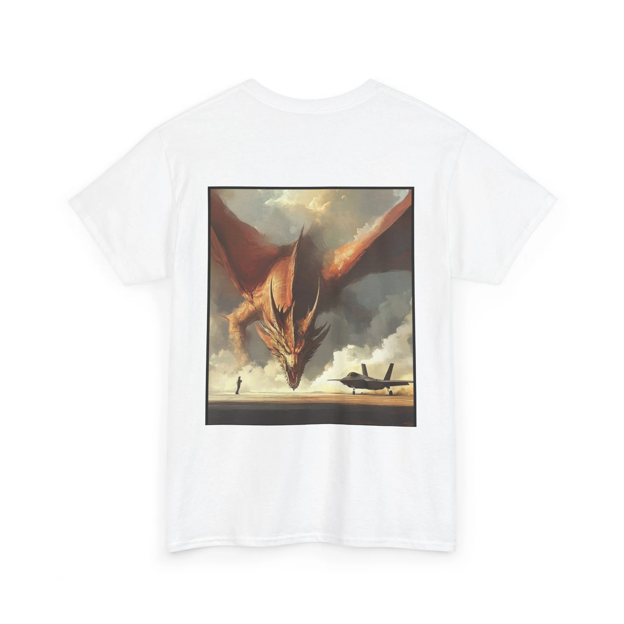 This tee brings a quiet, cinematic tension to everyday wear. A soft, sturdy cotton canvas carries a dramatic back print of a vast winged creature descending toward a lone figure and grounded aircraft. The image feels like a paused moment from a story—wide skies, heavy light, and a hush before action. Slip this on when you want a shirt that reads like a scene: bold without shouting, comfortable enough to wear all day, and crafted to hold its shape through washes. The small chest mark keeps the front minimal while the back art becomes the conversation starter.
