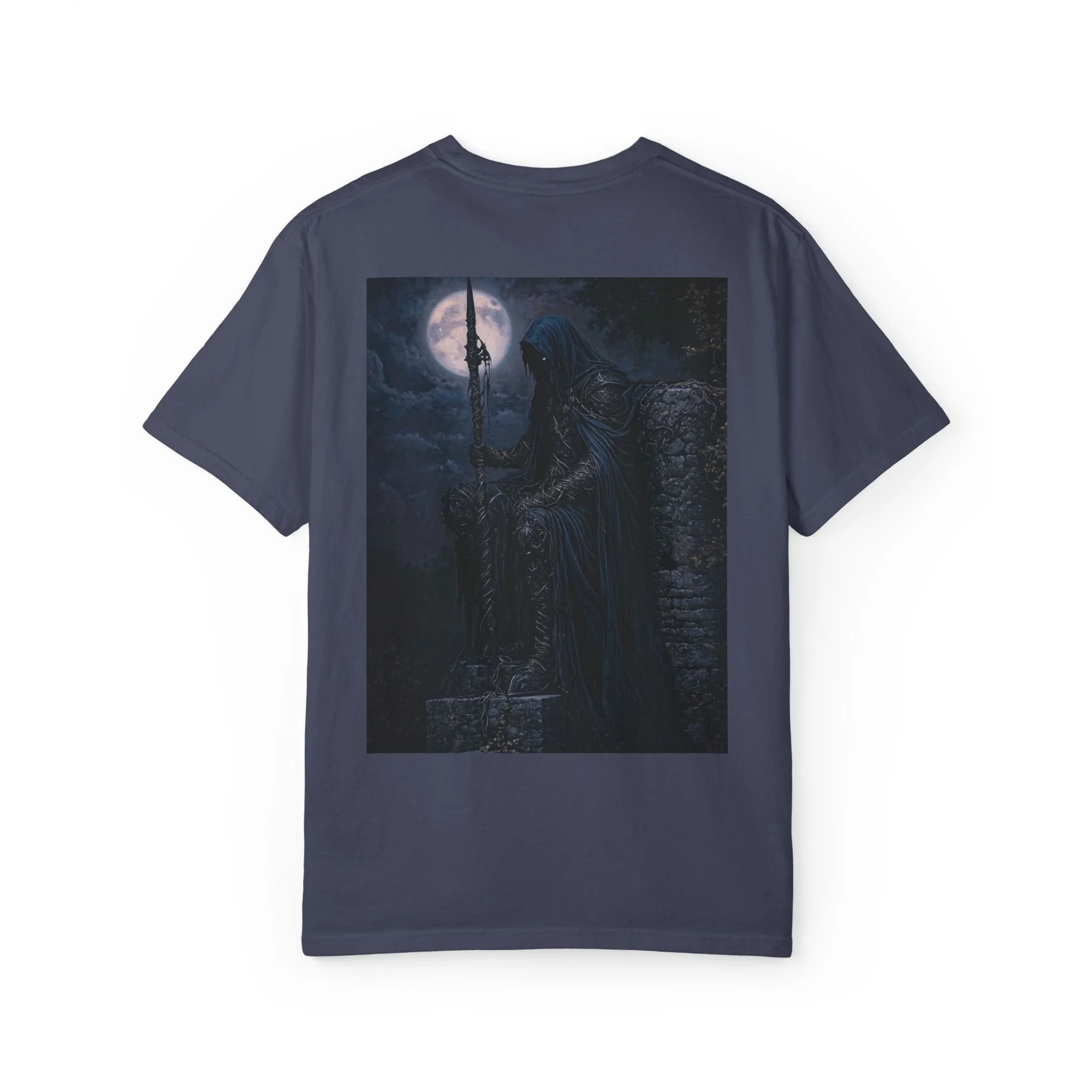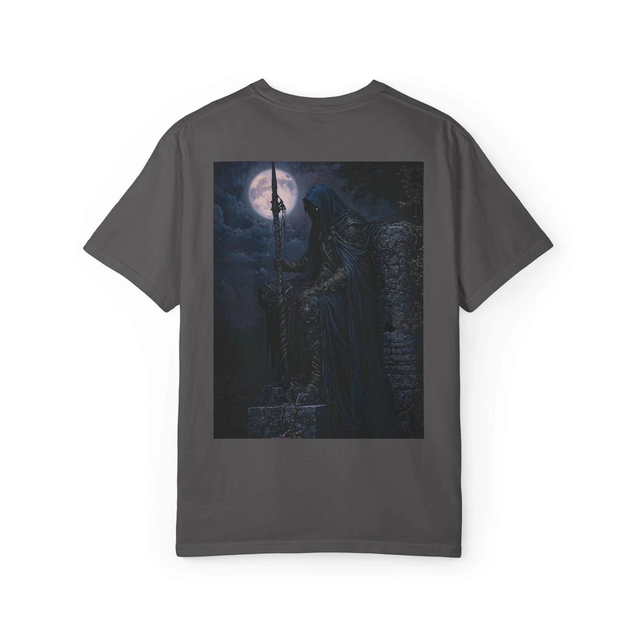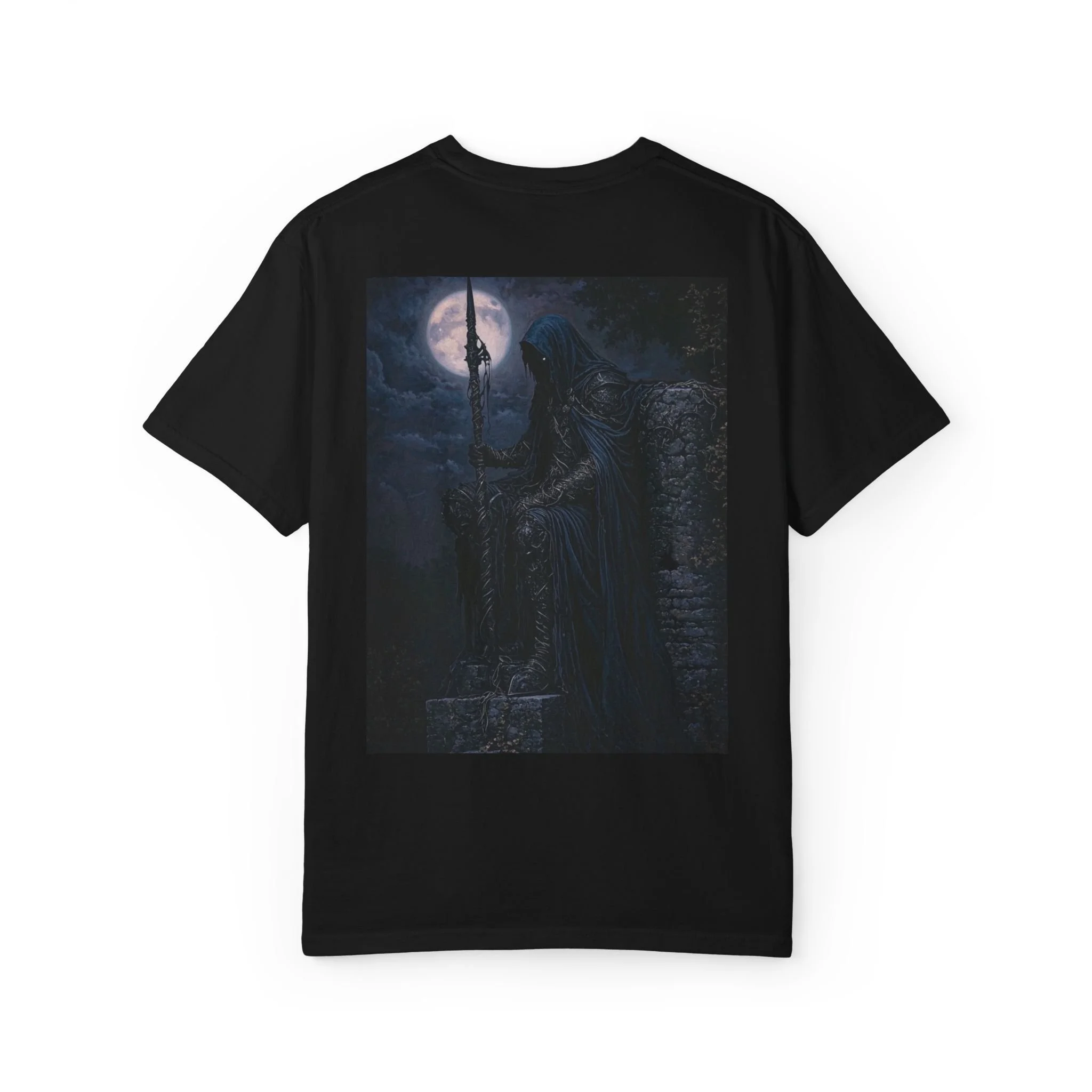 Cloaked in night, eyes like burning coals behind a veil of sorrow, he sits on broken stone—the last of a forgotten empire. His spear, twisted by time and witchcraft, pierces the earth like a warding rune.