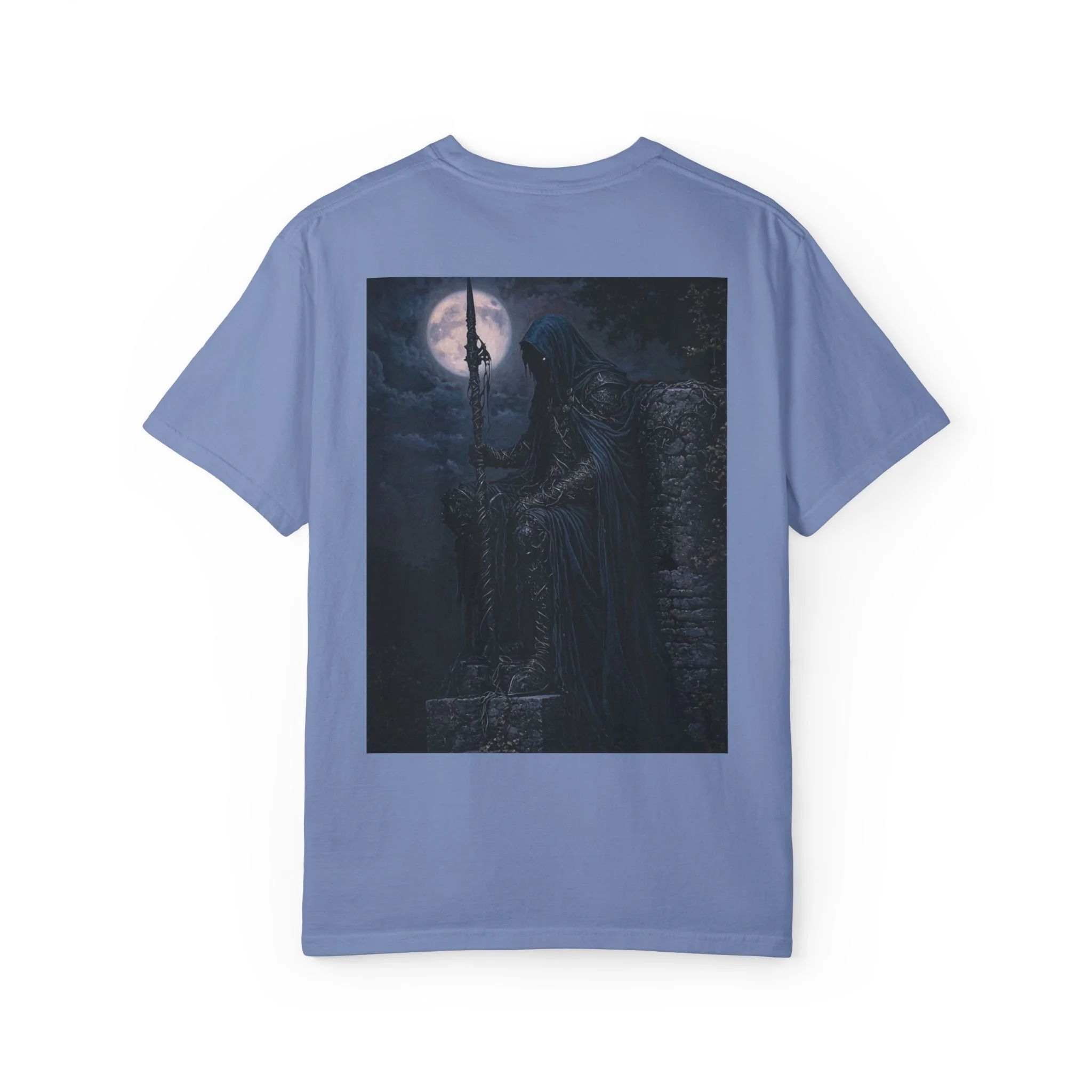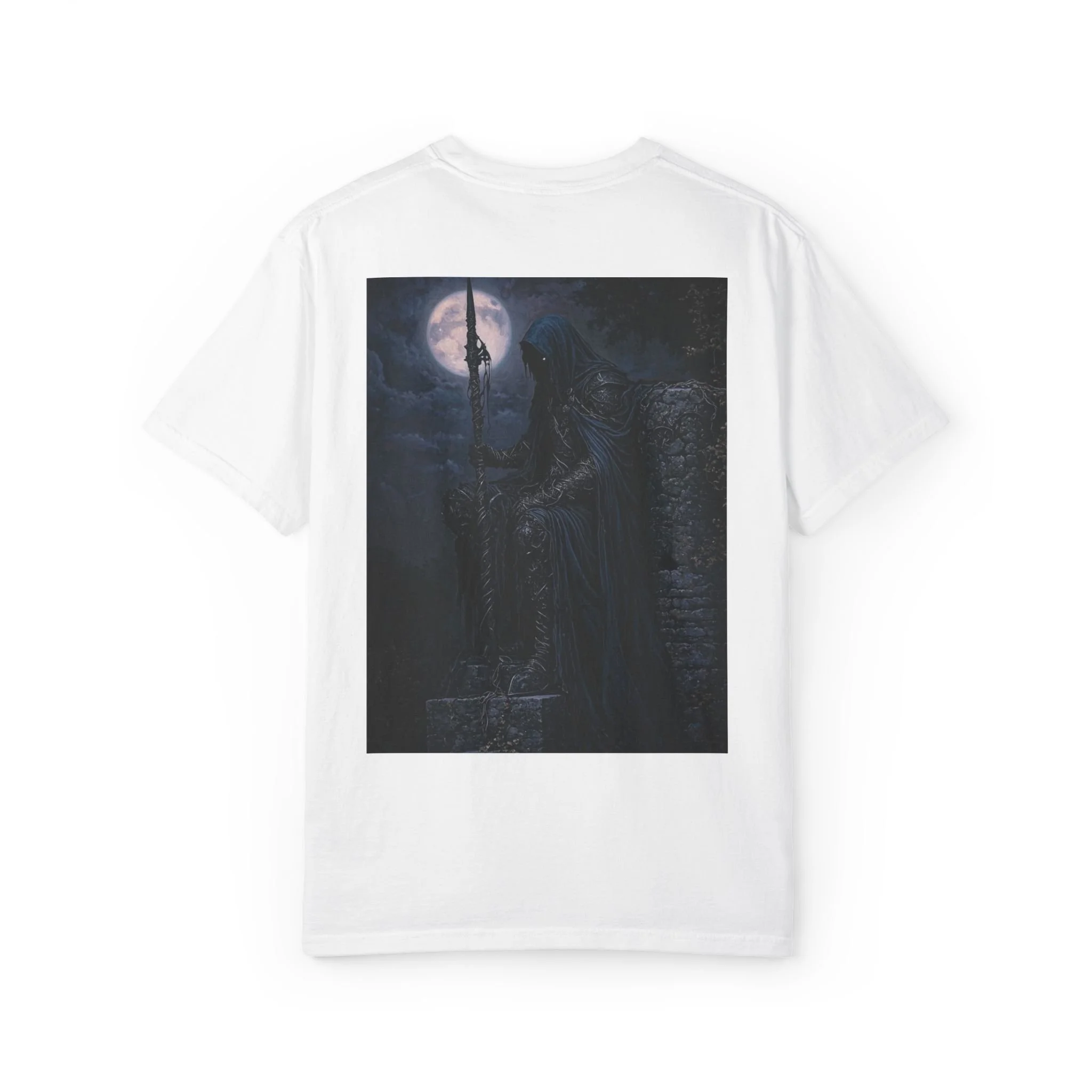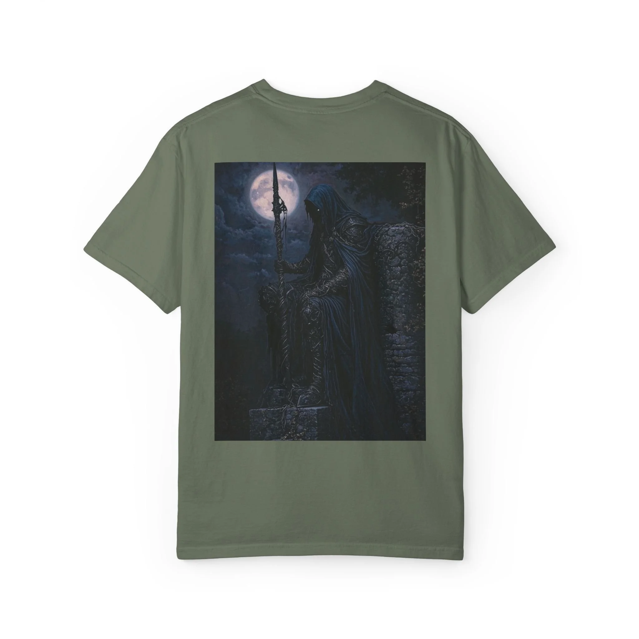 Cloaked in night, eyes like burning coals behind a veil of sorrow, he sits on broken stone—the last of a forgotten empire. His spear, twisted by time and witchcraft, pierces the earth like a warding rune.