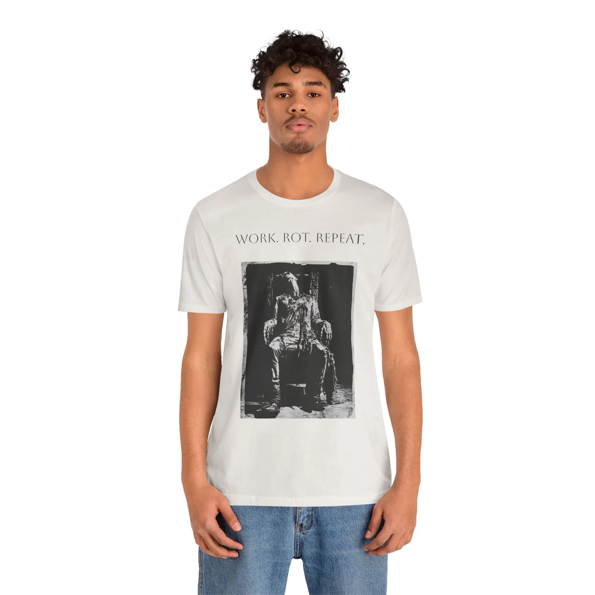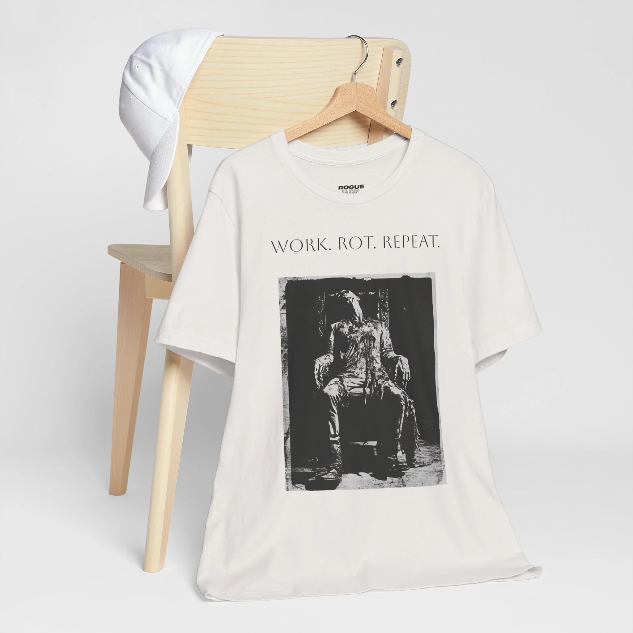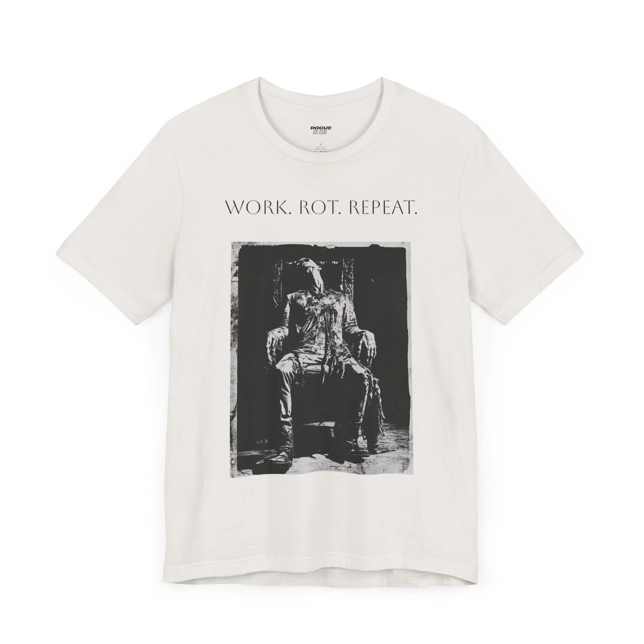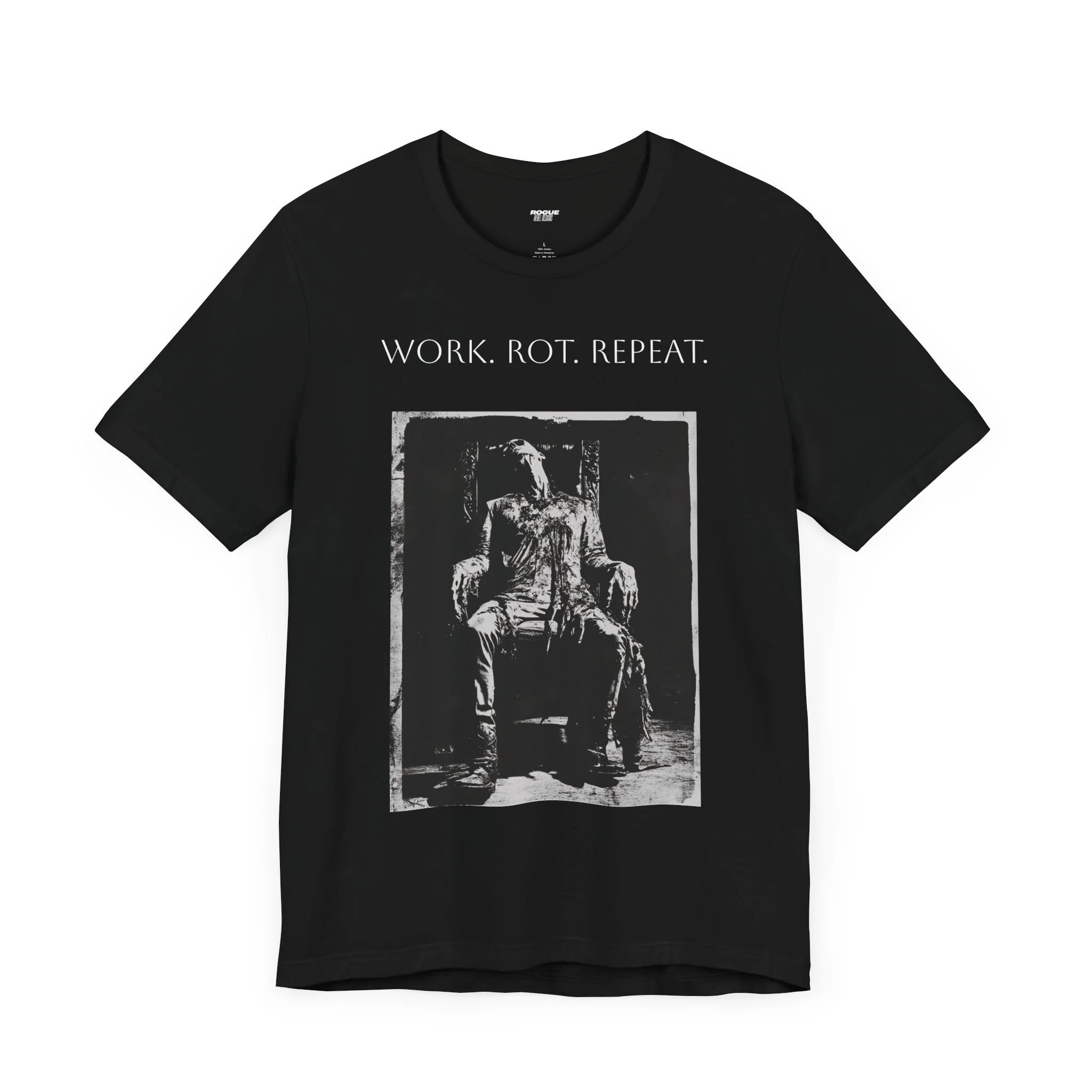 Work Rot Repeat T-shirt in black and white colors, giving off a raw and edgy vibe. This T-shirt is perfect for those who appreciate unique and artistic prints, and can be worn for casual outings or as a statement piece. Ideal for those who enjoy emo or gothic styles, and relevant for events like Halloween or alternative fashion gatherings.