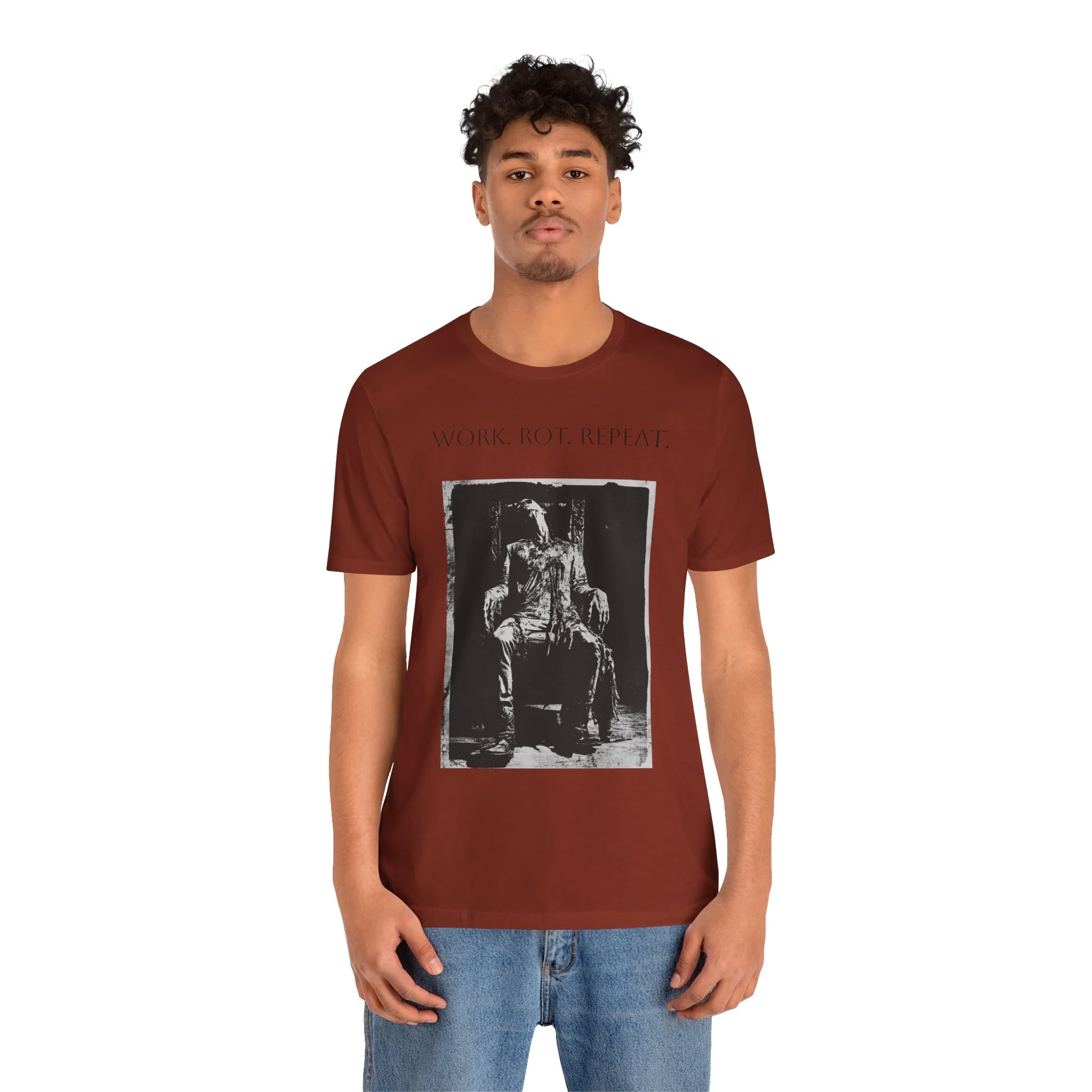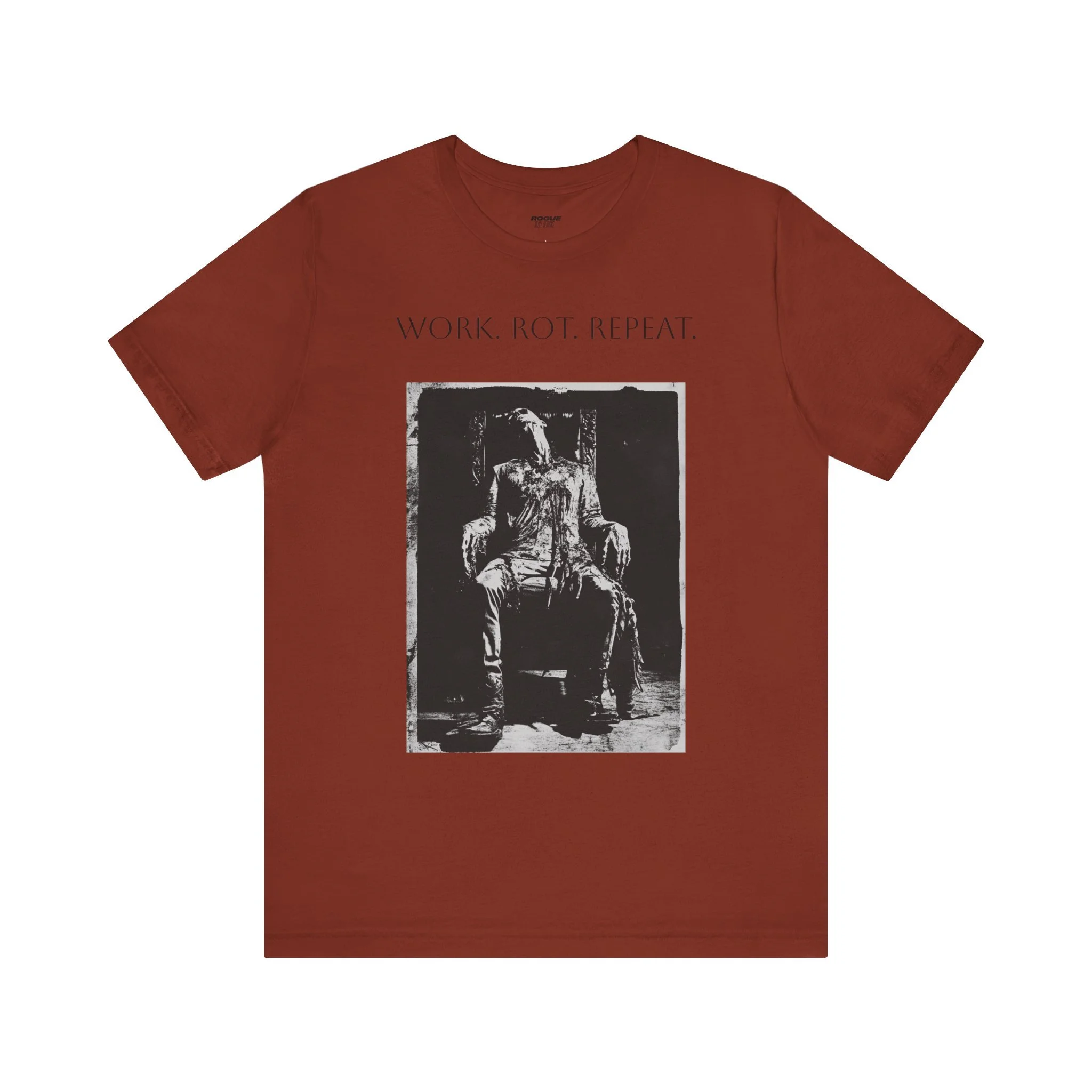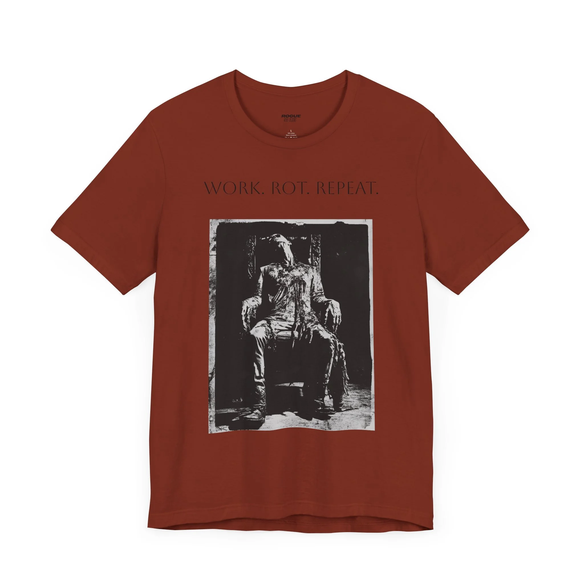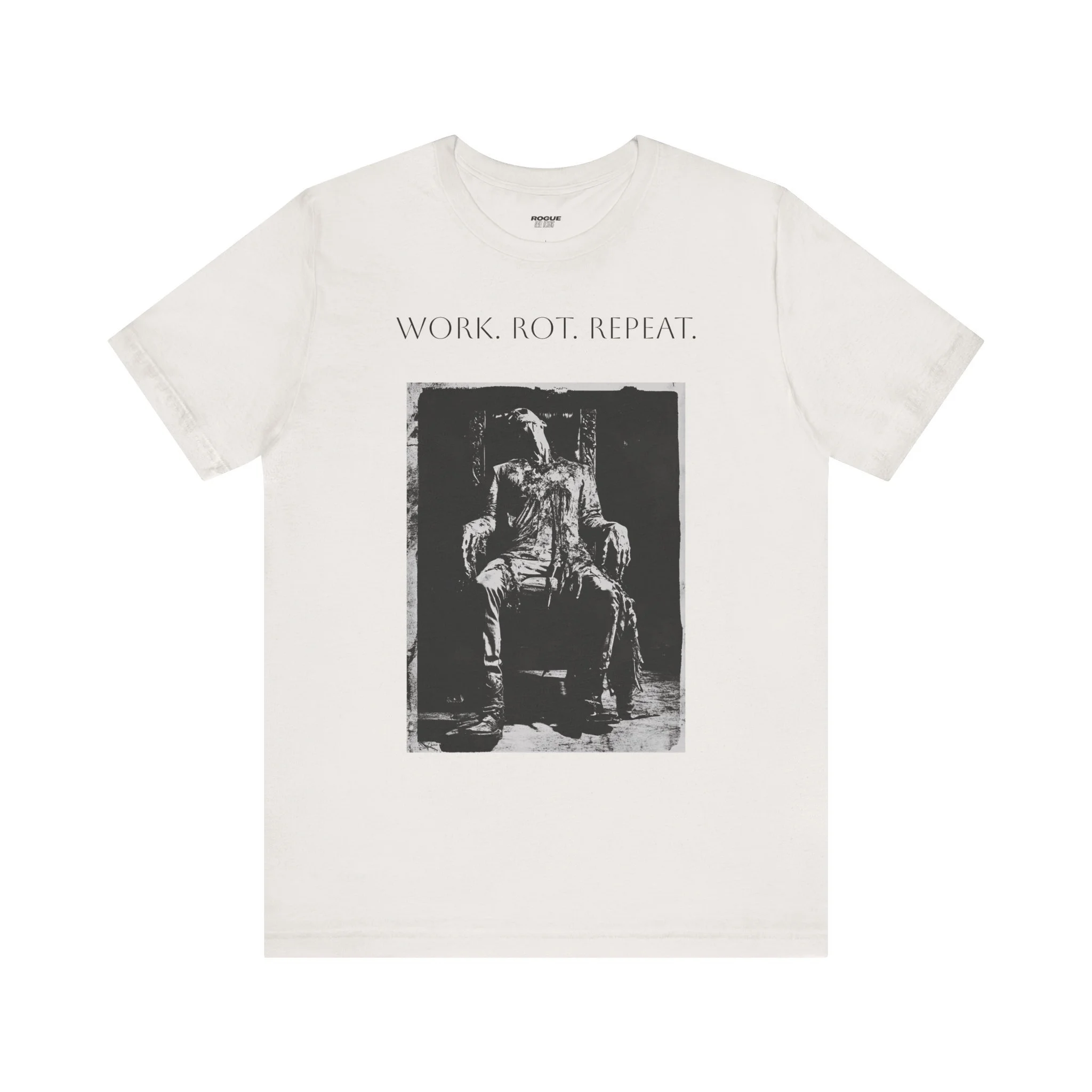 Work Rot Repeat T-shirt in black and white colors, giving off a raw and edgy vibe. This T-shirt is perfect for those who appreciate unique and artistic prints, and can be worn for casual outings or as a statement piece. Ideal for those who enjoy emo or gothic styles, and relevant for events like Halloween or alternative fashion gatherings.